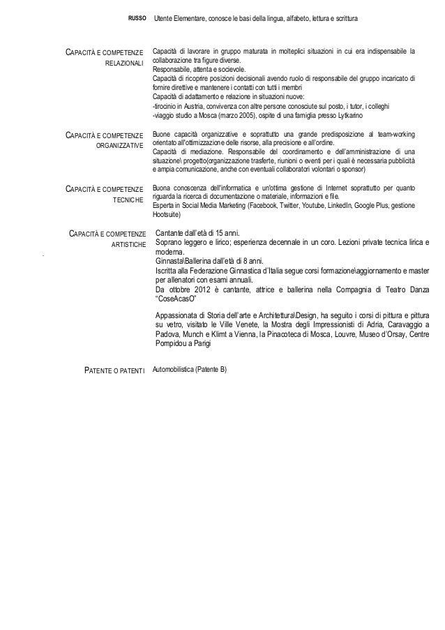 Spero che le tue capacità artistiche siano trasmesse anche ai tuoi figli. Anche le capacità interpersonali e il lavoro di squadra sono molto importanti. Per chi cerca lavoro è fondamentale sapere come scrivere una lettera di presentazione. Ad esempio se dopo un titolo lasciate uno spazio, assicuratevi di lasciarne sempre uno in tutto il cv e non, ad esempio una volta uno e una volta due. In esso, infatti, includiamo tra le altre, le nostre competenze e perizie manuali, intellettive, sociali, comunicative, istintive, sensomotorie, artistiche, psicologiche, ecc.