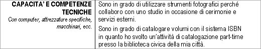Capacità E Competenze Tecniche Esempi. Se ancora non vi è del tutto chiaro, quali potrebbero essere le competenze tecniche da inserire nel vostro curriculum, leggete i nostri esempi per chiarirvi. Traduzione di capacità e competenze in tedesco. Le capacità e competenze tecniche sono uno dei punti fondamentali del cv, quindi devono saltare subito agli occhi del lettore.