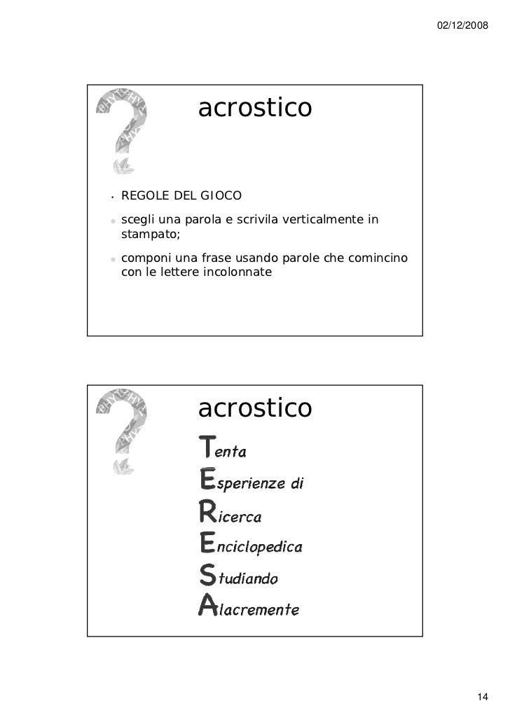 Esempi Di Acrostici Con Nomi. Un altro esempio di acrostico è il sonetto di boiardo: Se invece già sapete di che si tratta qui di seguito vi proponiamo degli esempi di acrostici di nomi partendo da un elenco di nomi di donna con la c. Intanto se non sapete cos'è un acrostico una curiosità dell'acrostico è che si sviluppa in verticale come da esempio qui sotto e che vi presentiamo partendo dalla parola sole