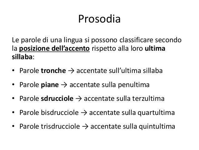 Le parole italiane, rispetto alla posizione dell'accento tonico, si classificano in parole piane, tronche, sdrucciole e bisdrucciole. Esempi su come usare la parola italian sdrucciole in una frase. Le parole sdrucciole sono quelle parole in cui l'accento tonico cade sulla terzultima o quartultima sillaba. Esistono anche parole atone, cioè prive di accento. In generale è possibile trovare parole bisdrucciole nelle terze persone plurale del presente indicativo di verbi la cui prima.
