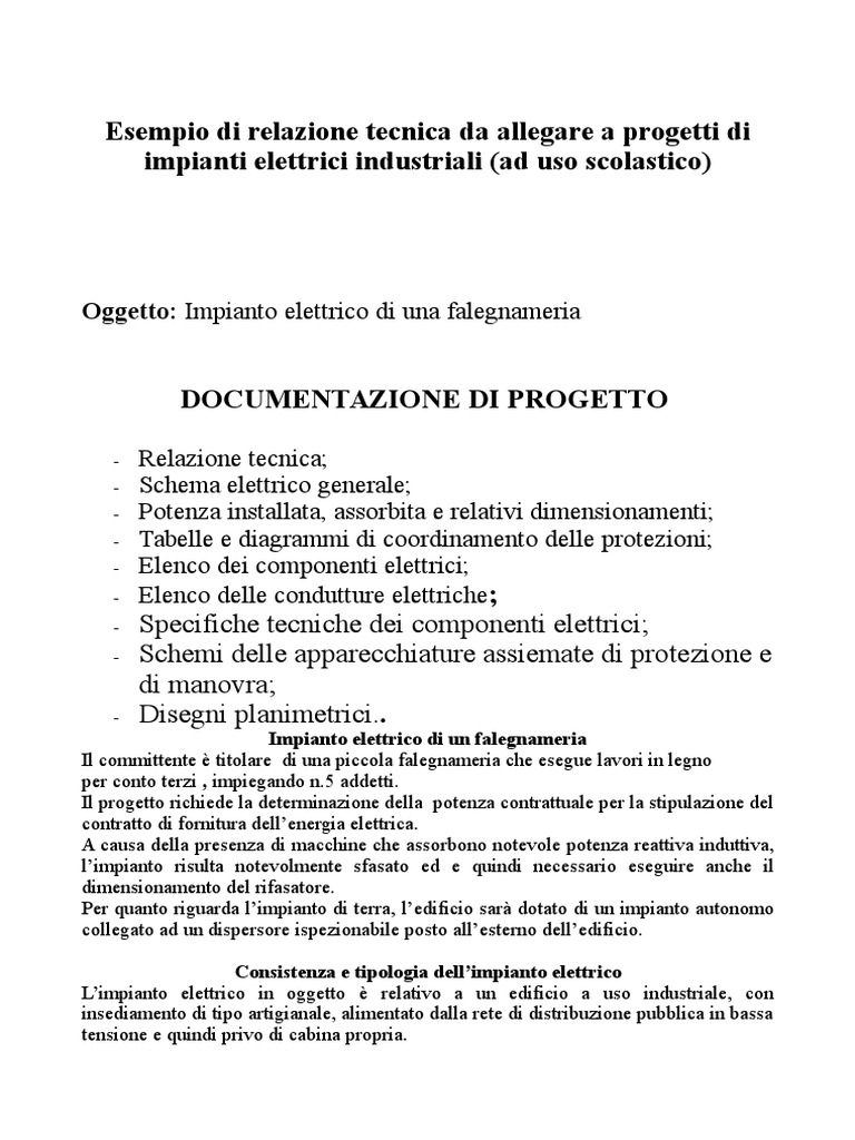 Esempio Di Relazione Tecnica Di Un Progetto. Relazione tecnica da allegare al progetto di un impianto elettrico industriale (l'esempio è riferito all'impianto elettrico di una falegnameria). L'edificio in progetto sarà interamente realizzato in muratura portante; Mi servirebbe progetto con relazione iniziale e finale bambino autistico per anno di prova.