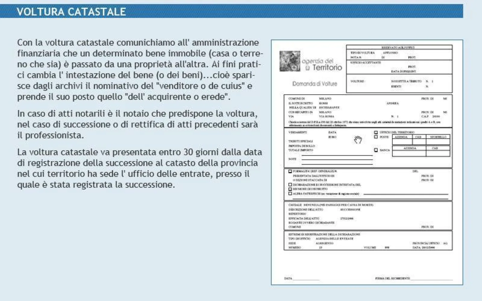 I primi dati che bisogna inserire sono quelli relativi all?ufficio del nello specifico, troviamo uno spazio su cui c?è scritto ufficio provinciale per esempio di milano o firenze, ed il comune dove si trova l?immobile. Voltura catastale 2021, cos'è, costo, quando e dove presentarla. Ma vediamo della voltura catastale per successione un esempio. Presentare la voltura catastale voltura catasto terreni parte 1 voltura catasto terreni parte 2 voltura catasto terreni parte 3.