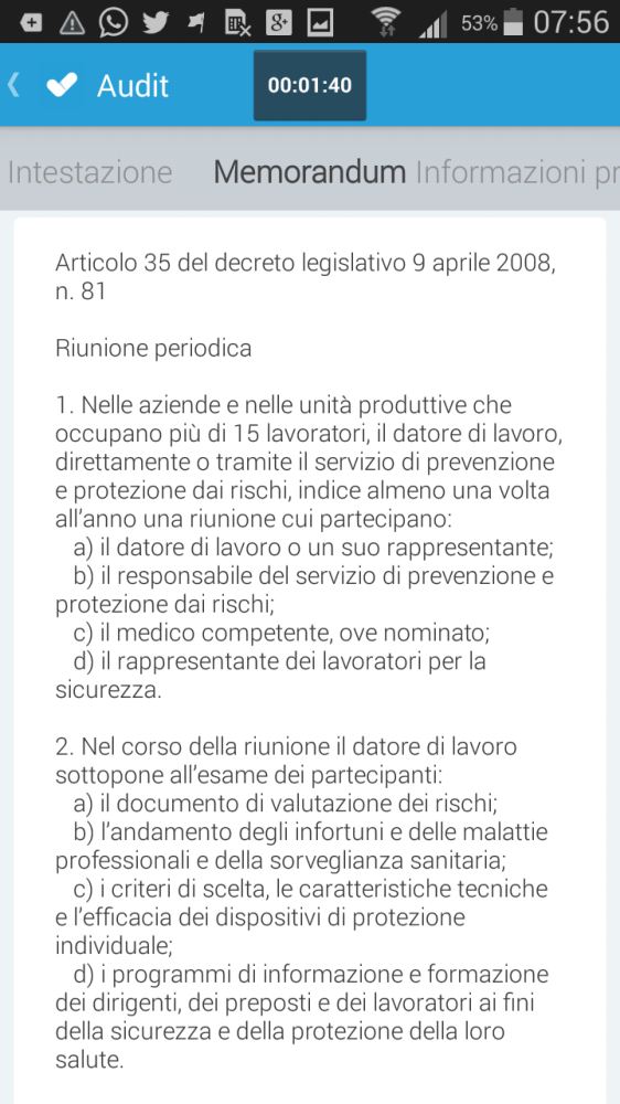 La riunione periodica, obbligatoria nelle aziende con più di 15 lavoratori, ha una periodicità almeno annuale e vedrà la presenza di: Chi convoca la riunione periodica e chi deve partecipare. L'andamento degli infortuni e delle malattie professionali e della sorveglianza sanitaria; La riunione periodica per la sicurezza sul lavoro. Esempio di verbale di verifica per società pmi.