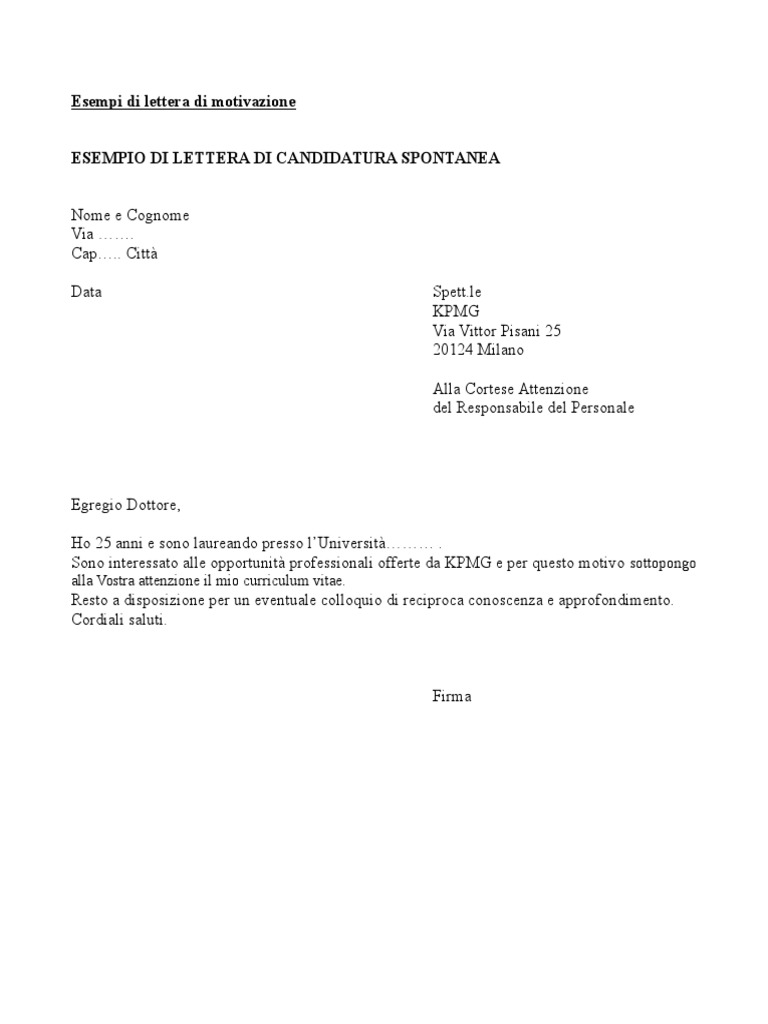 Chi è alla ricerca di lavoro, di solito, spedisce una lettera di candidatura ai potenziali datori di lavoro. Lettera di presentazione cv per candidatura spontanea. La lettera di motivazione o di presentazione è fondamentale e accompagna e introduce il curriculum vitae. Non esiste, infatti, uno standard di lettera di presentazione che va bene per tutti e in qualunque circostanza.